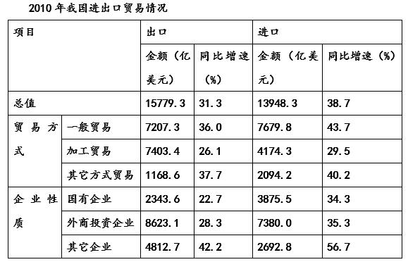 2010年,我国进出口贸易总额为29727.6亿美元,同比增长34.7%